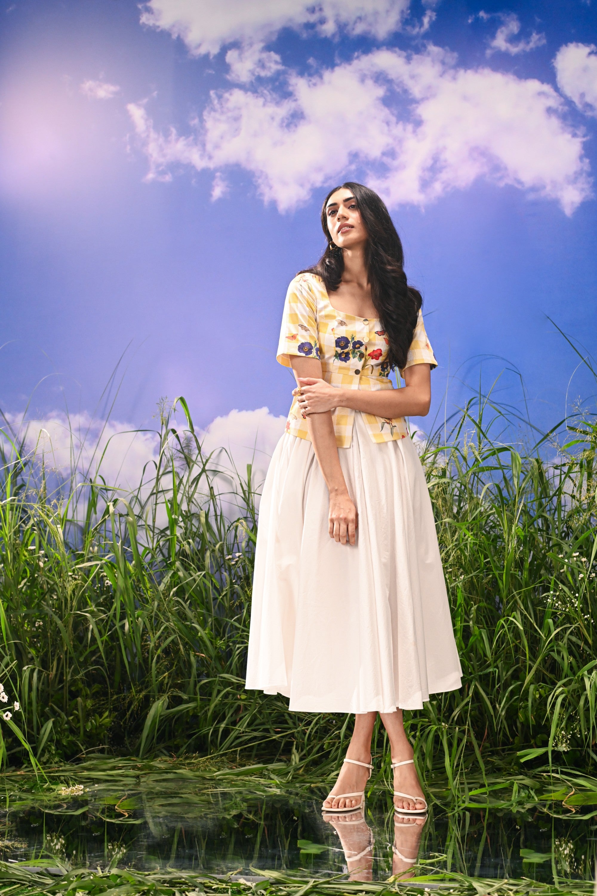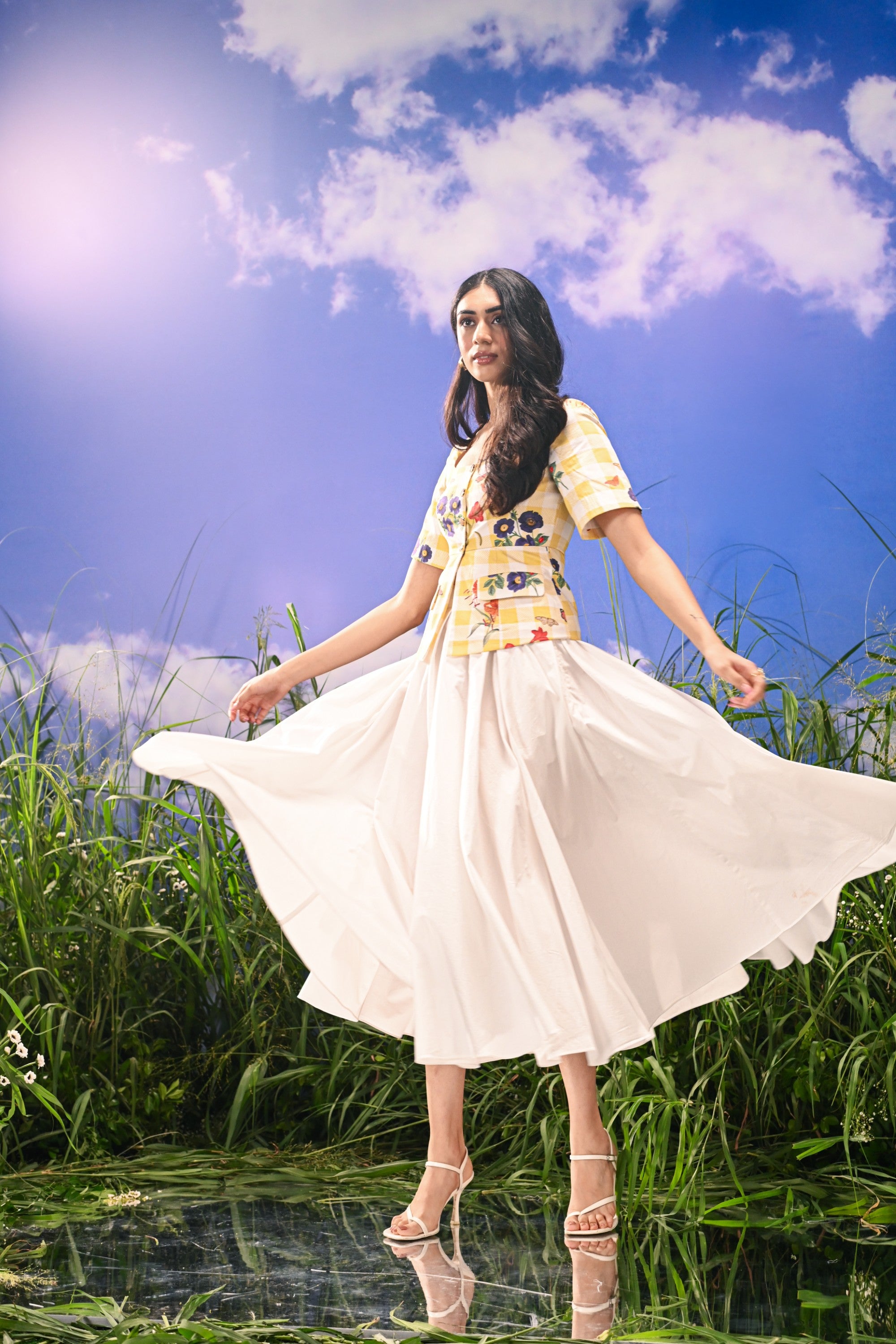 top- waistcoat style structured fit blouse with flap pockets & maxi skirt