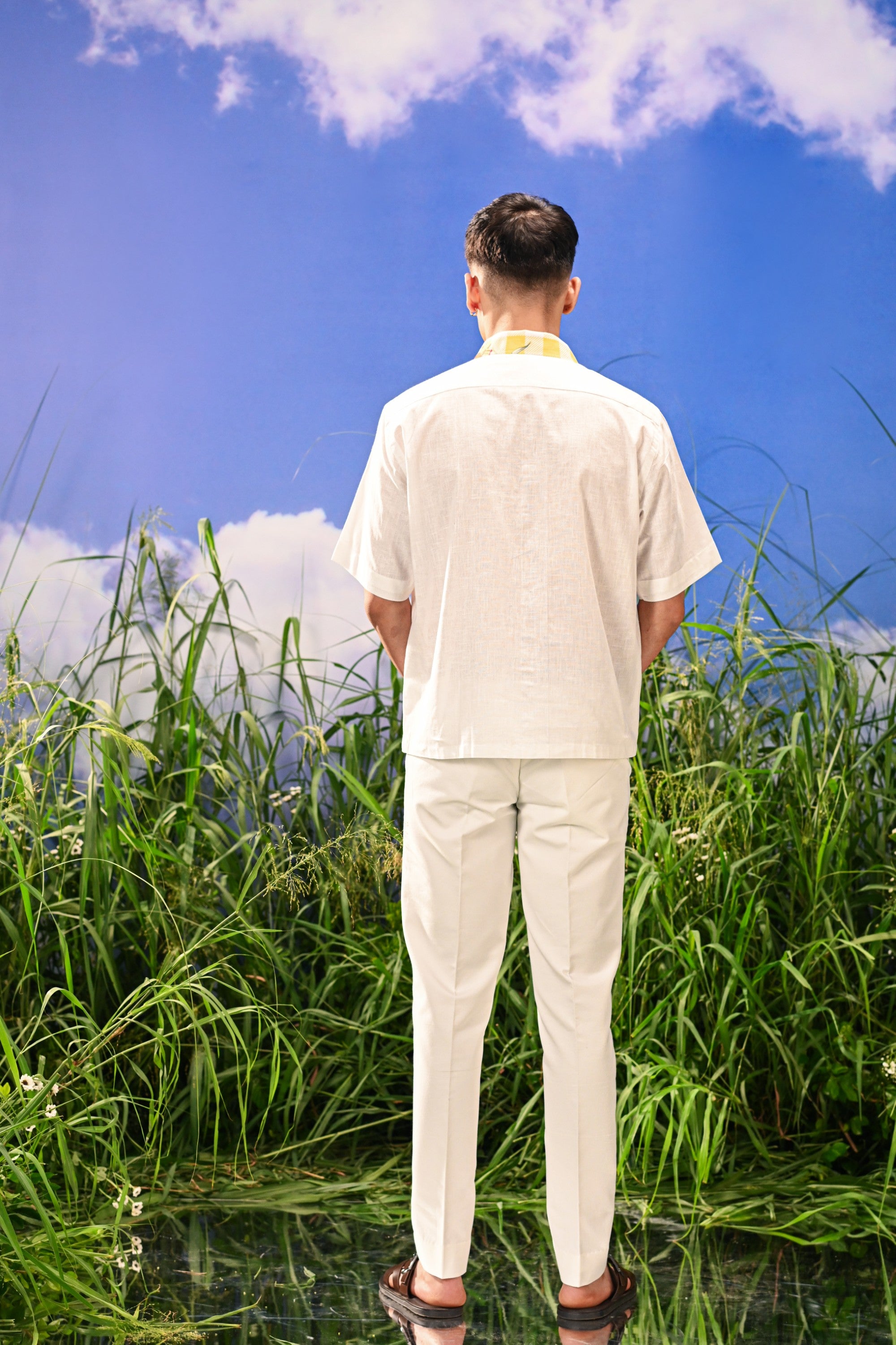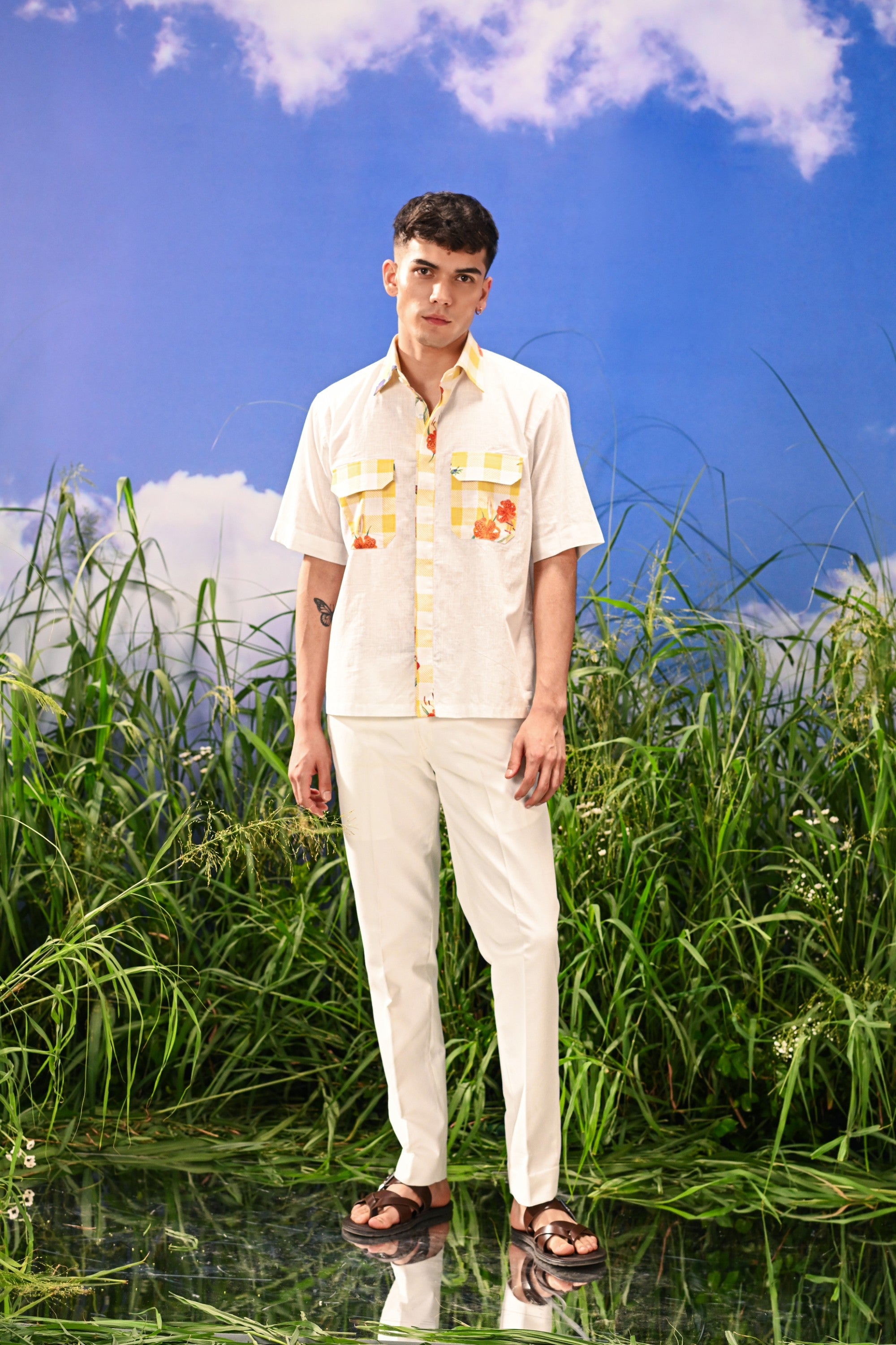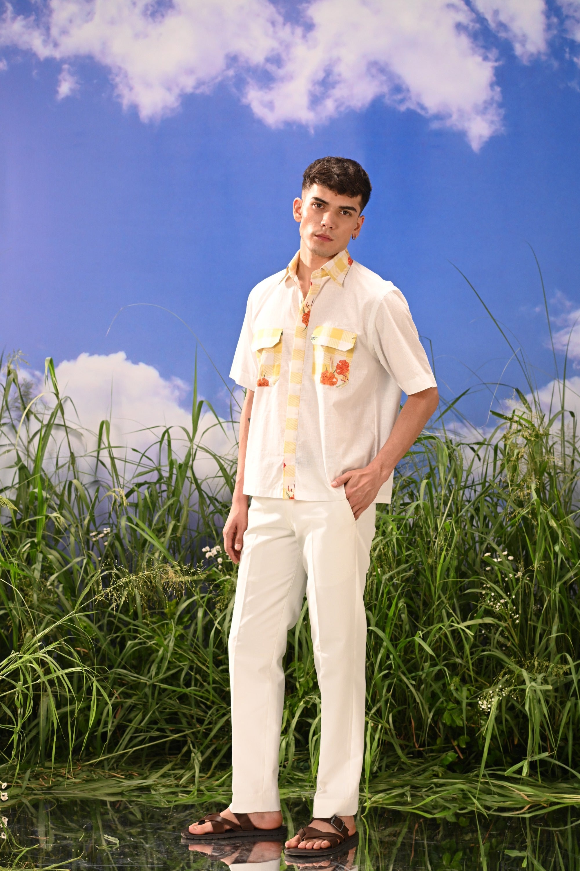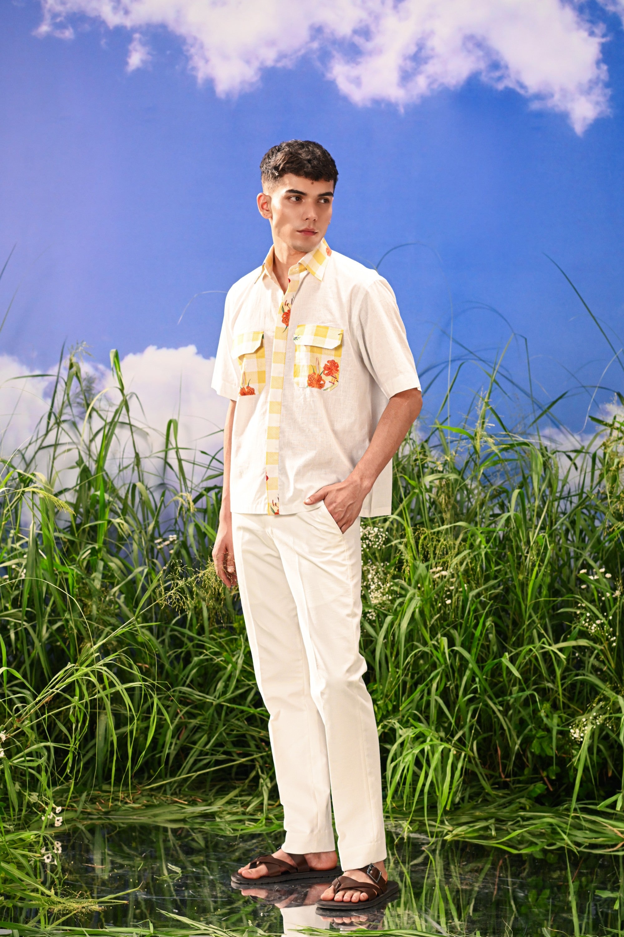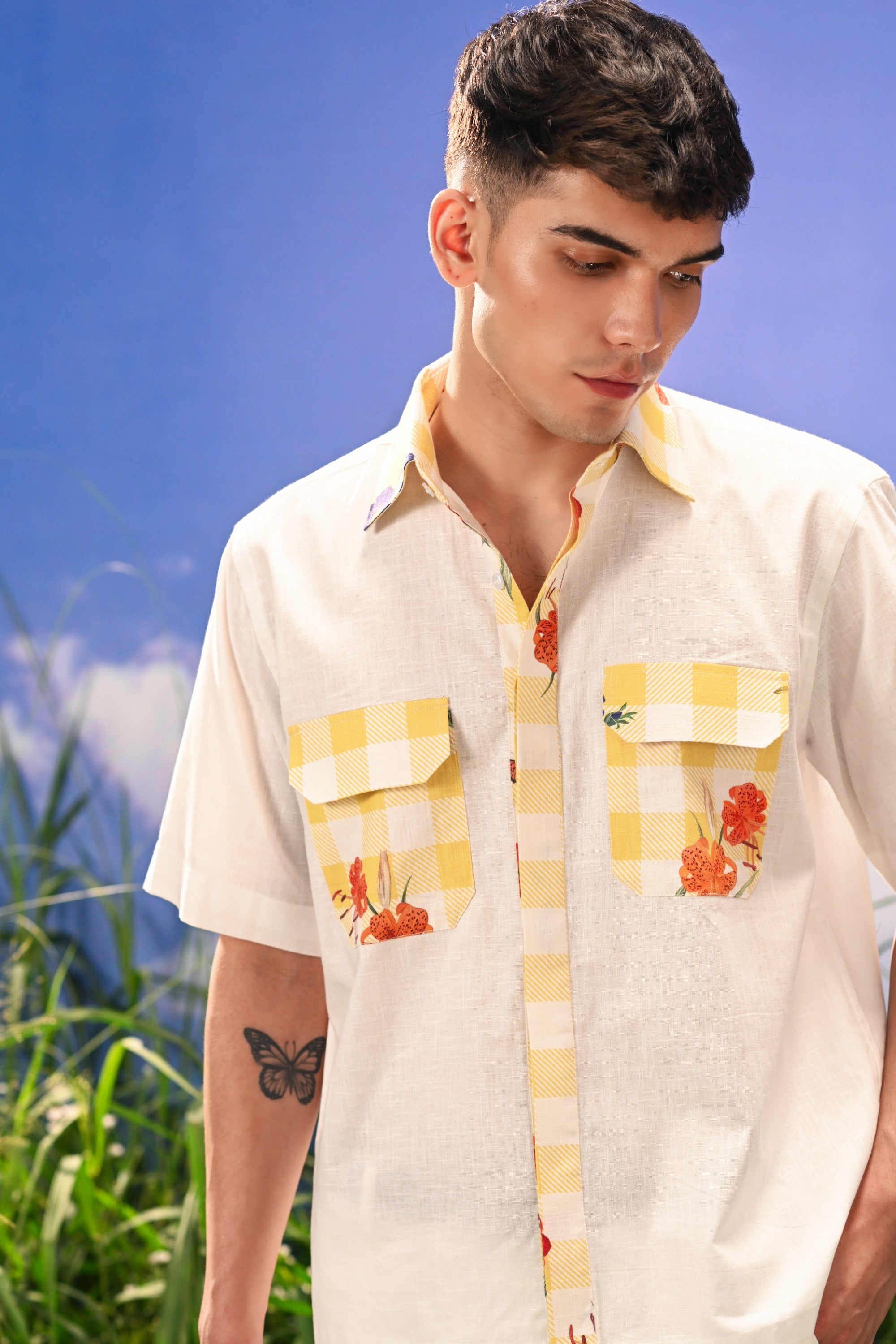 Breathable linen short sleeve shirt, highlighted with yellow gingham accents on placket and flap pockets.