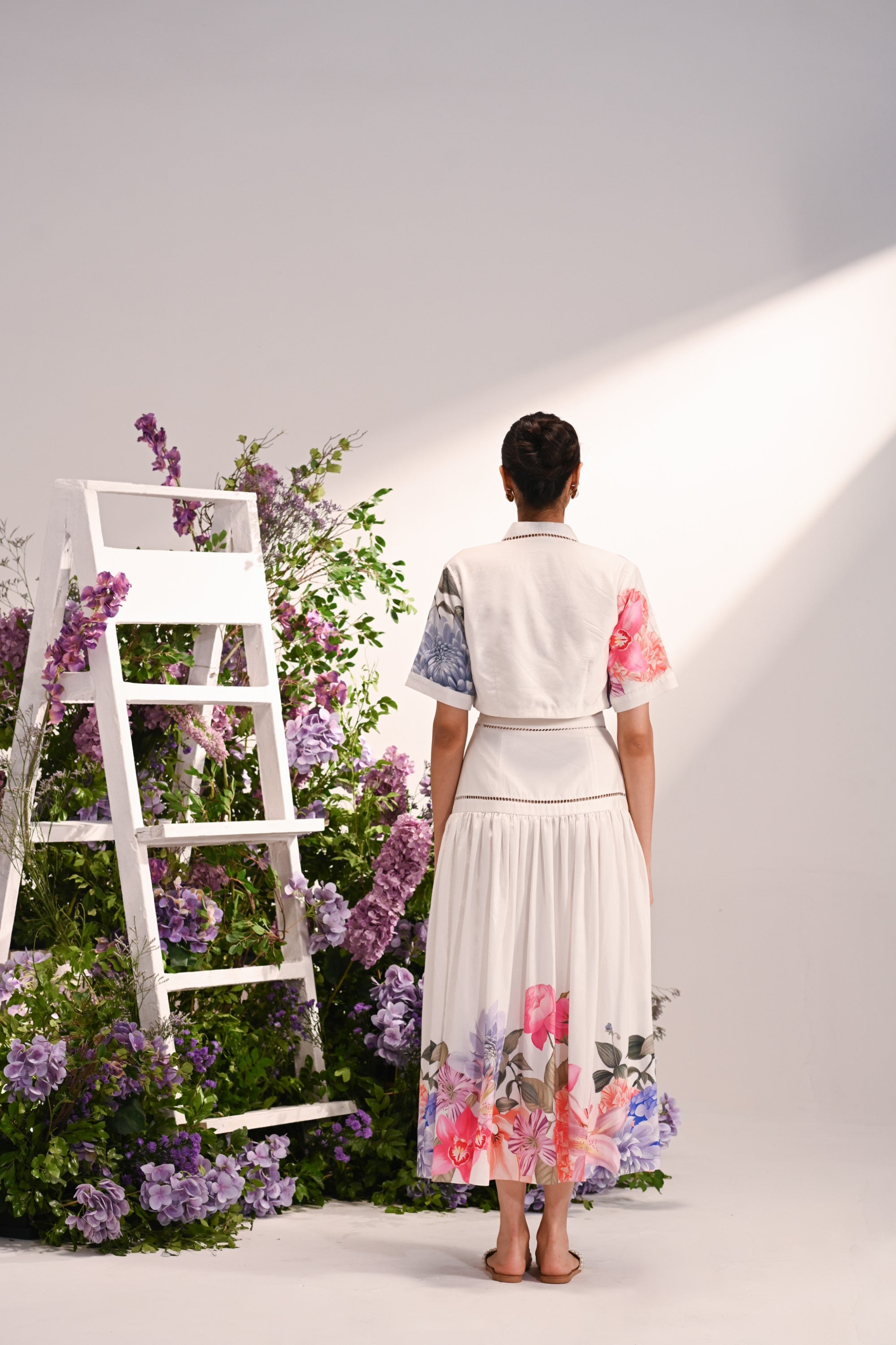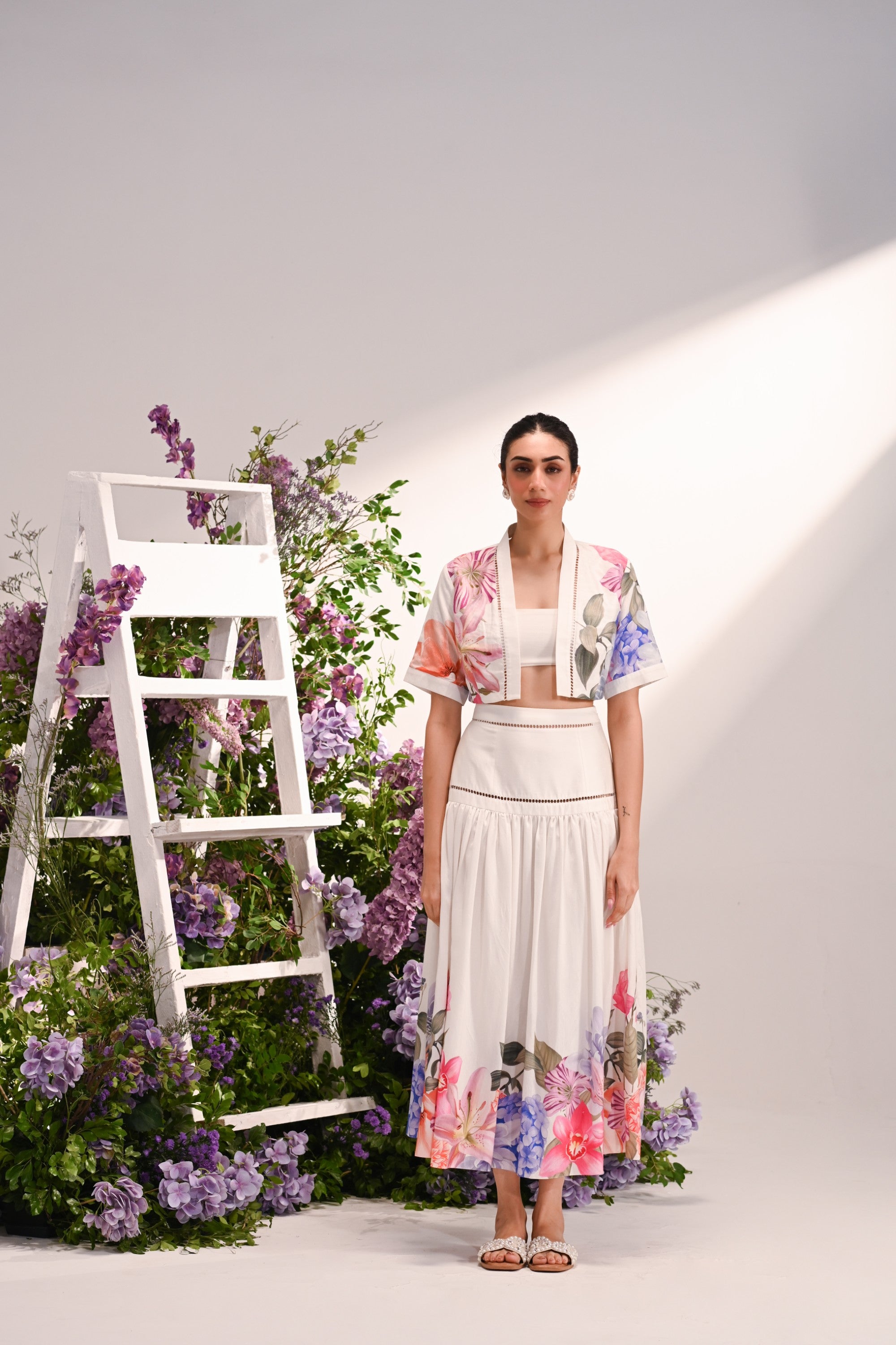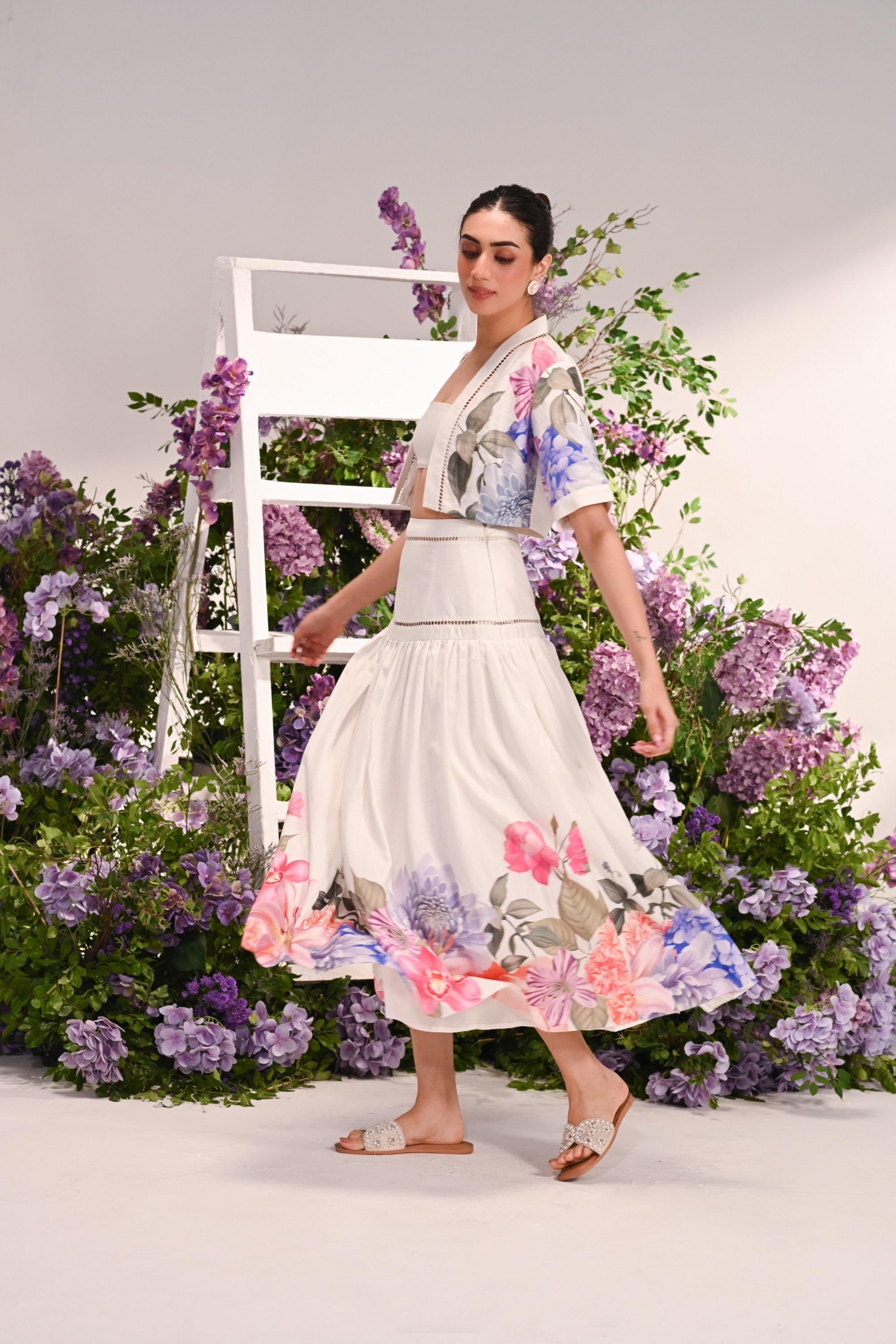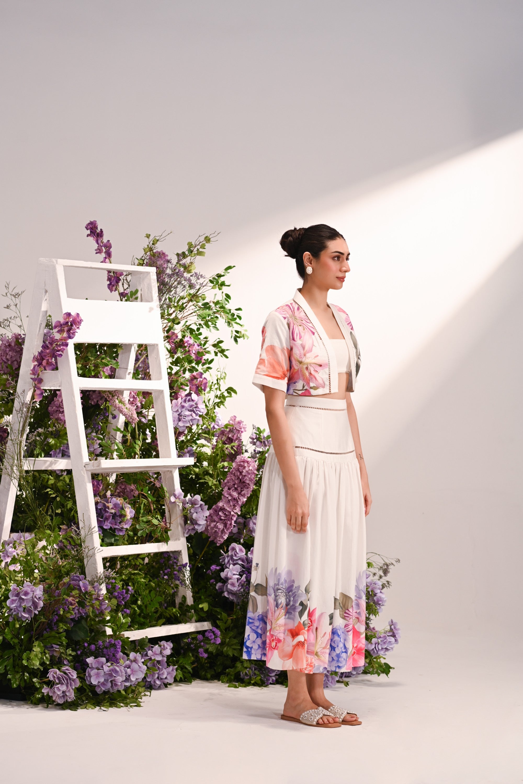 The Aurelia Co-ord Set is a vision of modern femininity and fluid grace. Crafted from a luxurious cotton-silk blend, this three-piece ensemble features an open crop top, a delicate bralette, and a flowing maxi skirt. Together, they create a look that’s light, elegant, and effortlessly statement-making, perfect for sun-soaked celebrations and evenings that shimmer with quiet sophistication.