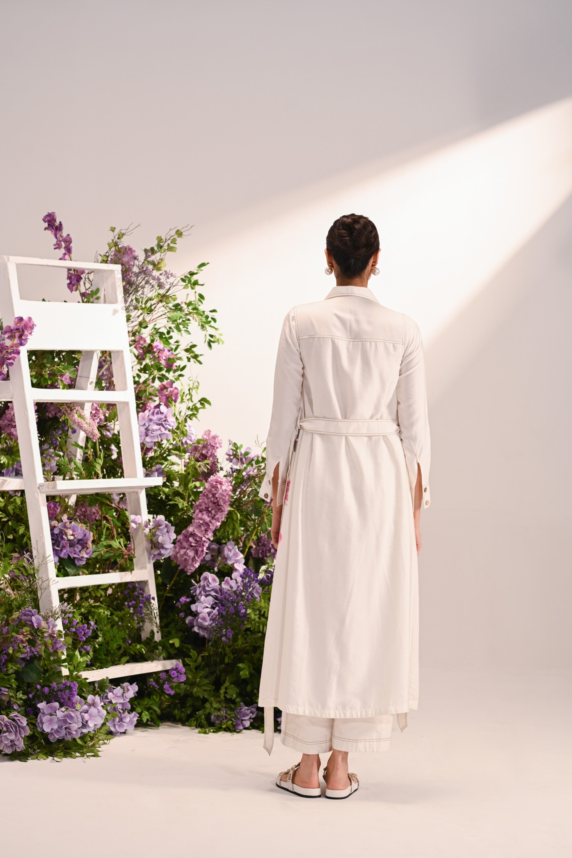 The Floridelle Co-ord Set blends timeless structure with soft sophistication. Crafted from a cotton-silk blend, it features a longline shirt jacket cinched with a tie belt, paired with coordinated bottoms for a refined yet relaxed silhouette. Elegant in detail and fluid in form, this set transitions effortlessly from day to evening, embodying modern poise with a touch of ease.